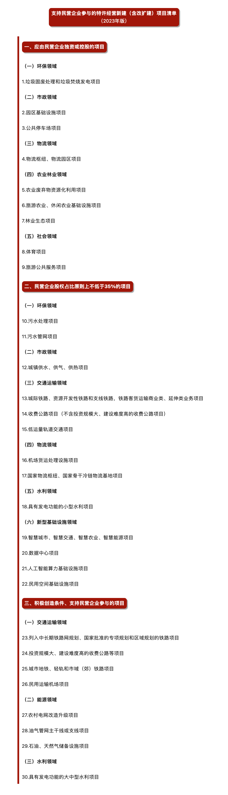 此外,《指導意見》還明確了支持民營企業參與的特許經營新建(含改擴建)項目清單(2023年版),最大程度鼓勵民營企業參與政府和社會資本合作新建(含改擴建)項目。