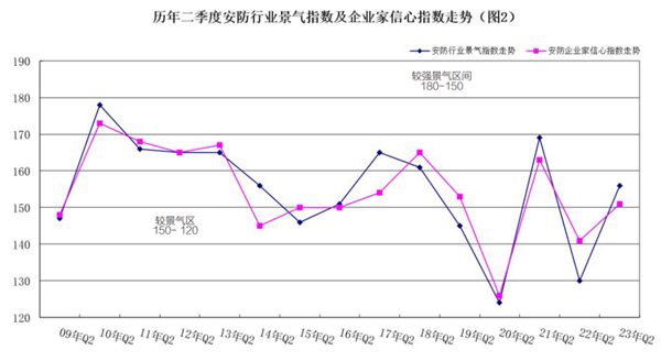 2023年二季度,我國安防行業(yè)景氣指數(shù)為156,與上季度相比上升了8點(diǎn),比去年同期上升26點(diǎn),位于“較強(qiáng)景氣區(qū)間”(見圖1-2)。調(diào)查企業(yè)中,有64%的企業(yè)認(rèn)為經(jīng)營狀況處于“良好”狀態(tài),與上季度相比上升9個百分點(diǎn),與去年同期相比上升21個百分點(diǎn);有28%的企業(yè)認(rèn)為“一般或持平”,比上季度下降10個百分點(diǎn),比去年同期下降了16個百分點(diǎn);有8%的企業(yè)反映經(jīng)營處于“不佳”狀況,比上季度上升了1個百分點(diǎn),比去年同期下降了5個百分點(diǎn)。