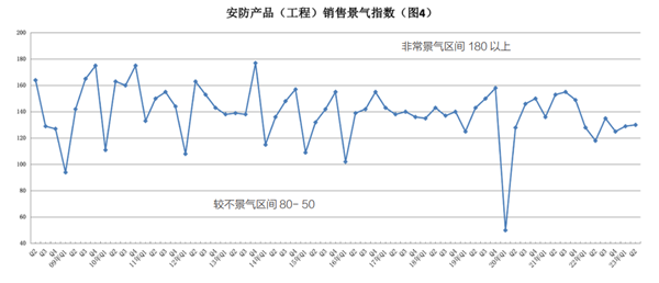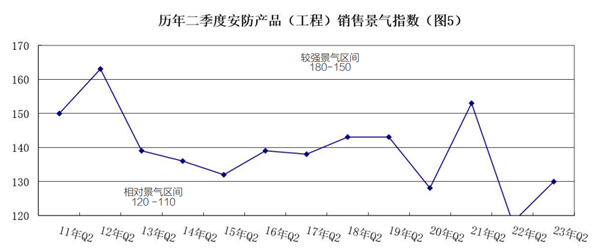 今年二季度,安防產(chǎn)品(工程)銷售景氣指數(shù)為130,比上季度上升了1點(diǎn),與去年同期相比上升了12點(diǎn),位于“較景氣區(qū)間”(見圖4-5)。其中,有40%的調(diào)查企業(yè)銷售額有了新的增長,比上季度下降了2個百分點(diǎn);有50%的企業(yè)反映銷售“持平”,比上季度上升了5個百分點(diǎn);有10%的企業(yè)反映“下降”,比上季度下降了3個百分點(diǎn)。