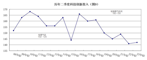 2023年二季度,安防企業(yè)科技投入景氣指數(shù)為142,比上季度上升了1點(diǎn),比去年同期上升了1點(diǎn),位于“較景氣區(qū)間”(見圖9)。其中,有48%的企業(yè)繼續(xù)增加了科技研發(fā)資金的投入,有47%的企業(yè)科研投入與上季度持平,有5%的企業(yè)投入下降。