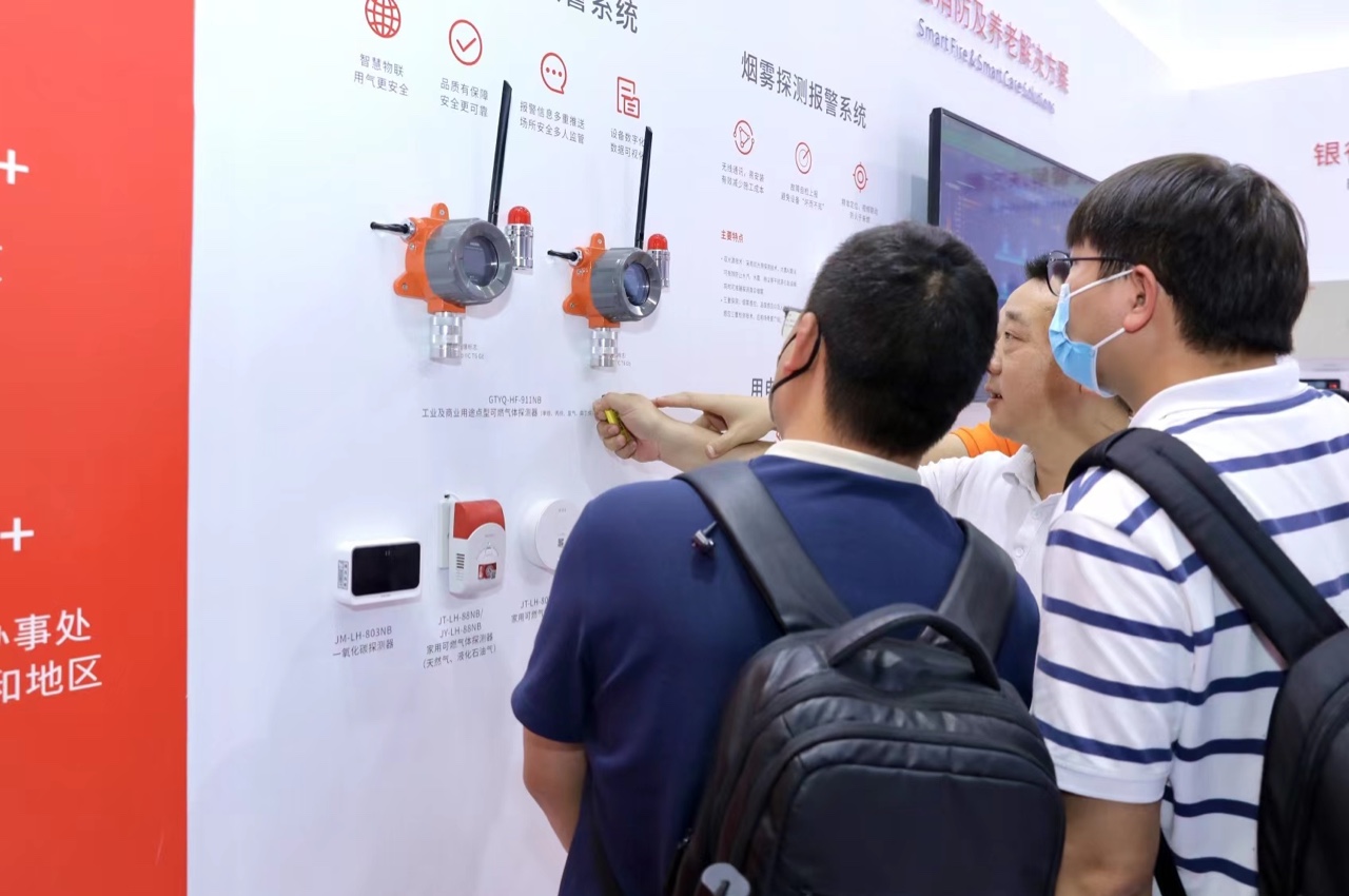 在展會左側墻面,智慧消防“1+N”解決方案成為了現場焦點,該解決方案涵蓋煙霧探測報警、可燃氣體報警、傳統消防改造等六大系統,可以實現水、電、煙、氣、火等在內的實時監測,建構“智慧消防火災防控一張網”。