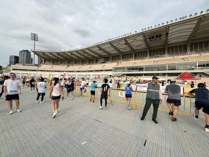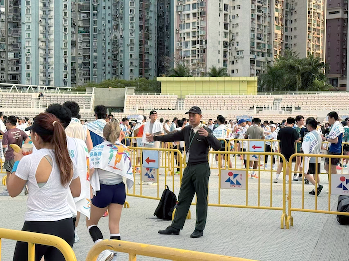 本屆賽事規模空前,吸引了來自全球近10,000名選手參賽。面對高密度人流、多區域管控及賽事動線復雜性,澳門衛安依托豐富的大型活動安保經驗,構建了"三位一體"安保體系:在起點/終點設置多層安防圈,通過智能防護與人工巡邏結合實現無死角守護;賽道沿線部署機動小隊,實時應對突發狀況;觀眾區域采用分區導流方案,確保人車分流、秩序井然。