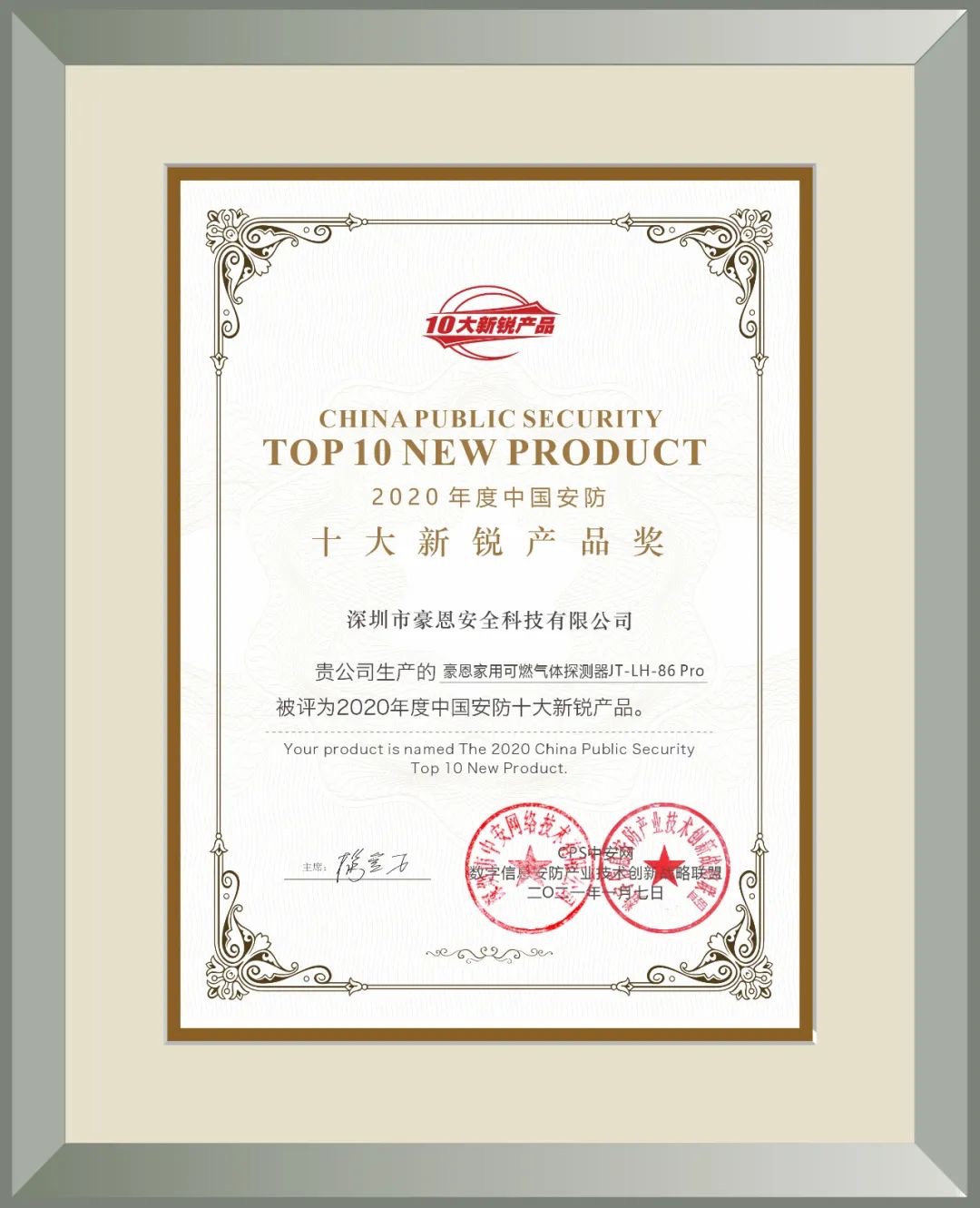 在團拜會頒獎典禮上,中安科股份成員公司 — 深圳市豪恩安全科技有限公司(以下簡稱“豪恩”)的家用可燃氣體探測器 JT-LH-86 Pro 新品,榮獲了“2020 中國安防十大新銳產品”獎項,同時入圍的還有海康威視、大華、華為、天地偉業等公司的新品。
