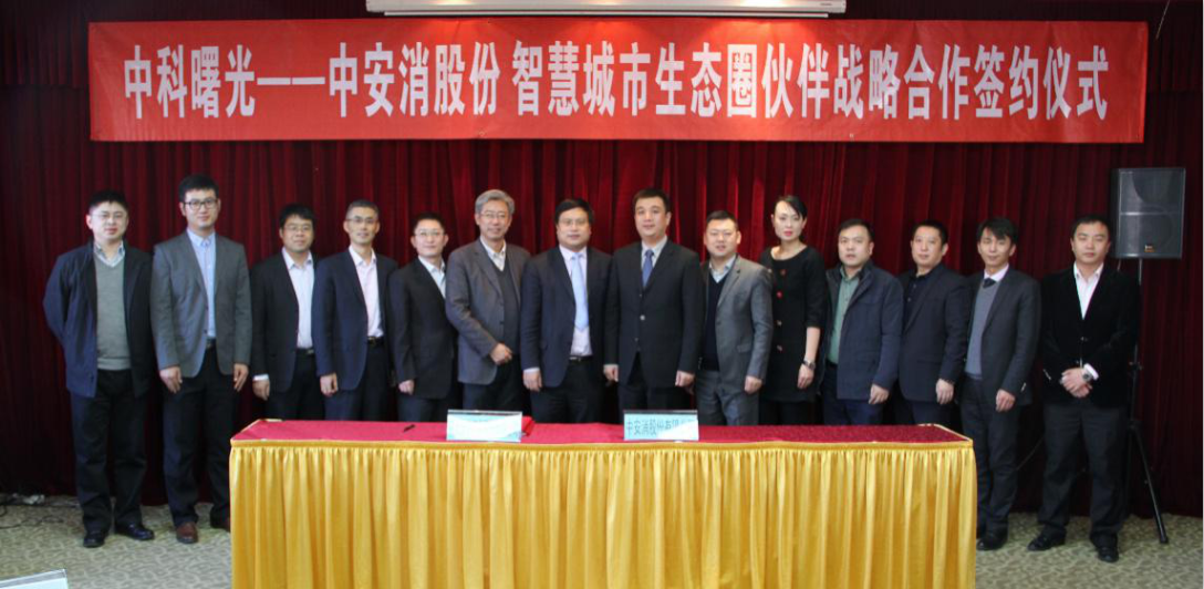 2016年1月12日,中安科股份與中科曙光在北京嘉賓國際酒店正式簽署了《智慧城市生態圈伙伴戰略合作框架協議》(以下簡稱《框架協議》)。本著優勢互補、平等互利、合作共贏的原則,經友好協商,雙方就智慧城市、城市公共安全、大安防投資、系統集成、云計算服務等領域達成了合作共識。中安科股份副董事長兼總裁周俠、中安消技術副總裁兼華北區域、華中區域中心總經理郭鵬、中安科股份市場發展中心總經理王穎、中安消技術總裁助理兼智能交通中心總經理朱恒偉一行出席了本次簽約儀式。
