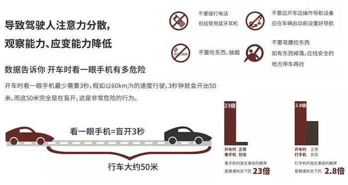 開車需要全神貫注,若開車玩手機,視線離開了道路,從意識到危險發生時,把視線從手機轉移路面,加上反應時間和制動過程,往往會出現追尾以及交通安全事故的情況。