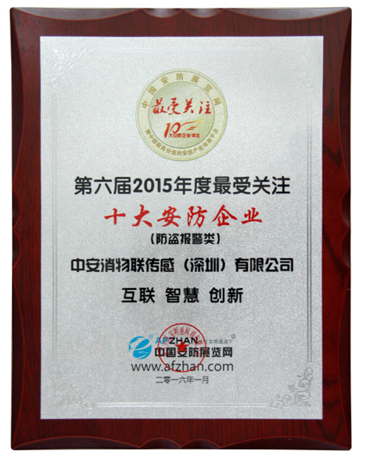 2016年03月29日,第六屆“思正杯”最受關注十大安防企業評選頒獎盛典暨第二屆中國安防新產品/新技術研討會在杭州拉開序幕。中安消物聯傳感(深圳)有限公司(以下簡稱“中安消物聯傳感”)在本次活動中榮獲“2015年度最受關注十大安防企業(防盜報警類)”稱號。