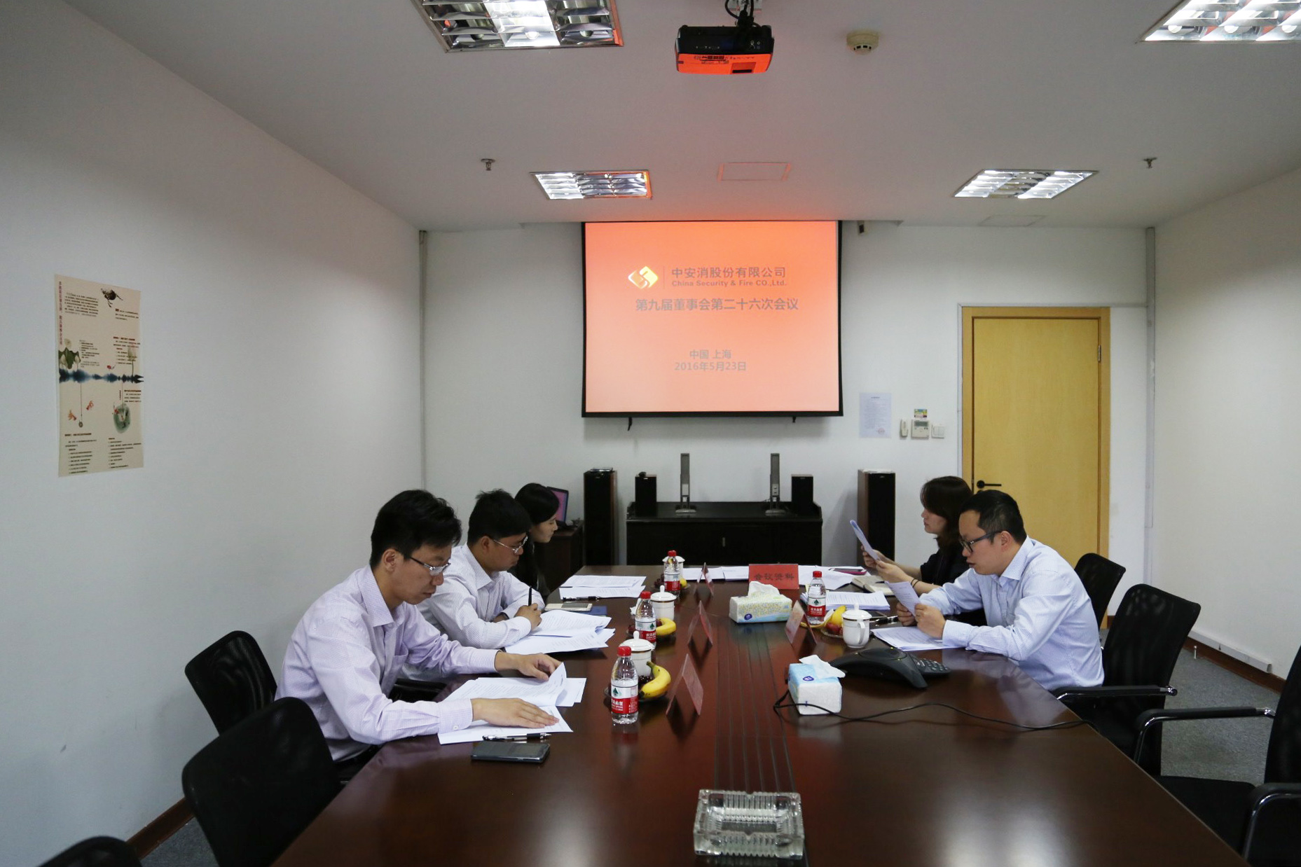 圖2:董事會(huì)會(huì)議(上海會(huì)場):左排:監(jiān)事:王一科(左三)、吳展新(左二)、陳亞南(左一);右排:董事會(huì)秘書:付欣(右二)、證券事務(wù)代表:劉小榕(右一)