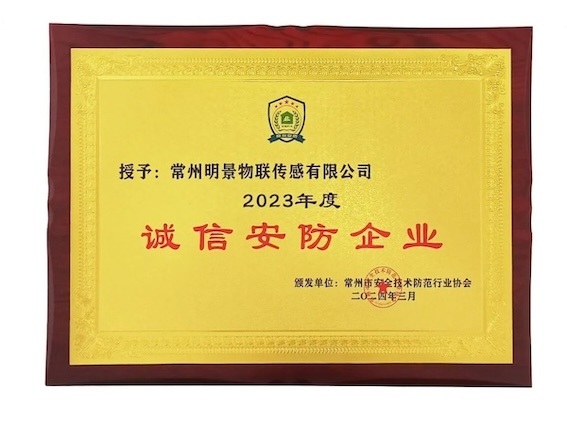 中安科子公司常州明景物聯傳感有限公司榮獲“2023年度誠信安防企業”及"2023年度常州安防行業優秀安防產品”榮譽稱號。
